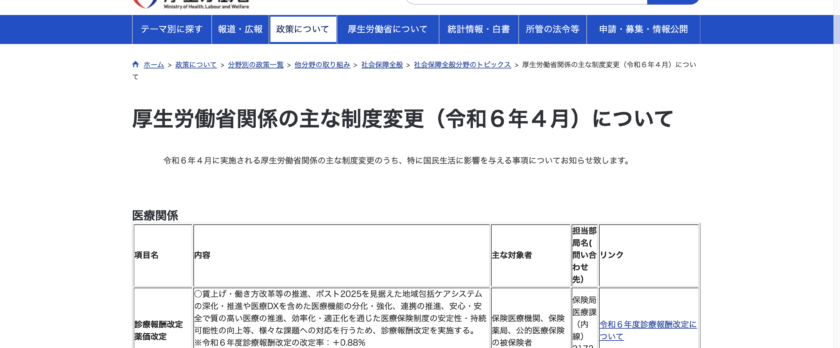 厚生労働省は、令和6年4月に実施される厚生労働省関係の主な制度変更のうち、“特に国民生活に影響を与える事項”について、ホームページ上で公表しています。